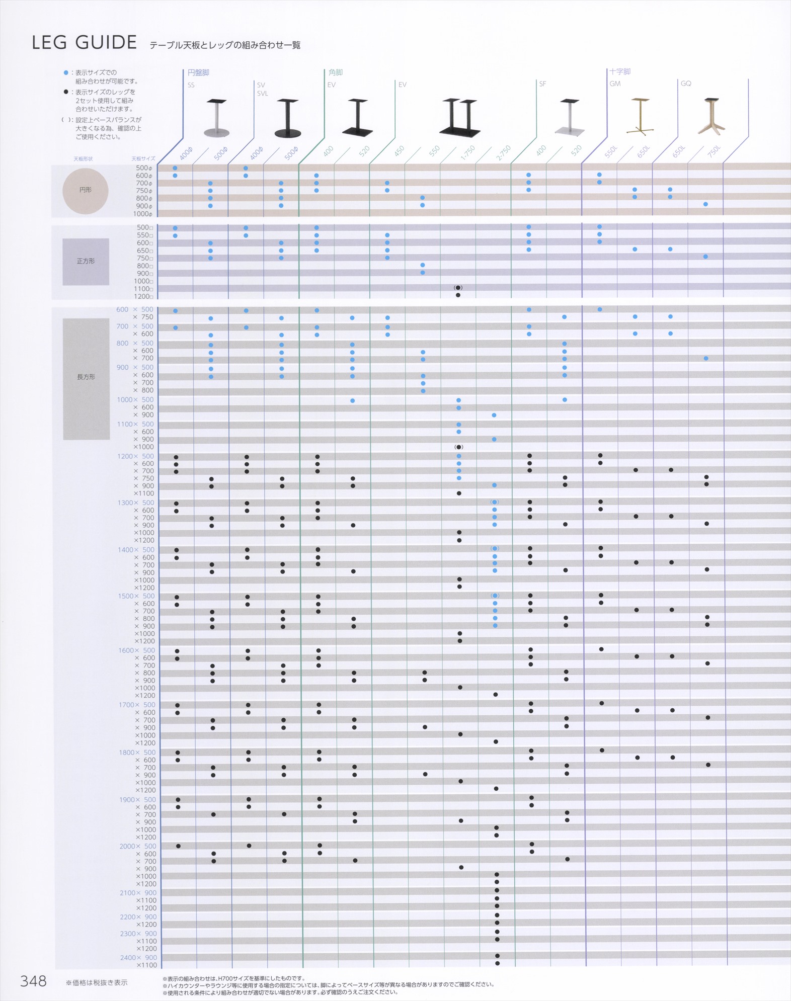 LEG GUIDE テーブル天板とレッグの組み合わせ一覧